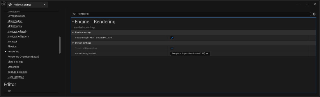 Temporal Upsampling must be enabled, and Anti-Aliasing Method should be set to Temporal Super-Resolution (TSR), in the Project Settings > Rendering window, accessed via Edit > Project Settings in the Unreal Engine toolbar or via Console Variables by enabling r.TemporalAA.Upsampling and setting r.AntiAliasingMethod to 4.