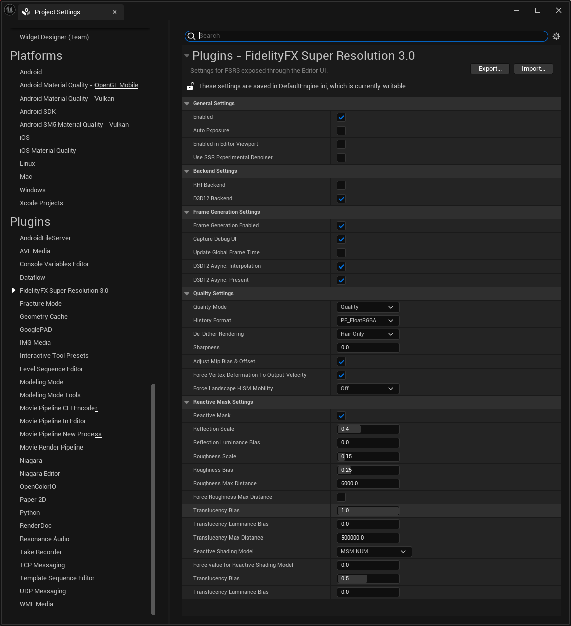 FSR 3.1 can be enabled or disabled via the Enabled option in the Project Settings > FidelityFX Super Resolution 3.1 settings window, or with the console variable r.FidelityFX.FSR3.Enabled in the configuration files. The variable can be modified at runtime however this is not guaranteed to be safe when other third-party upscalers are also enabled.