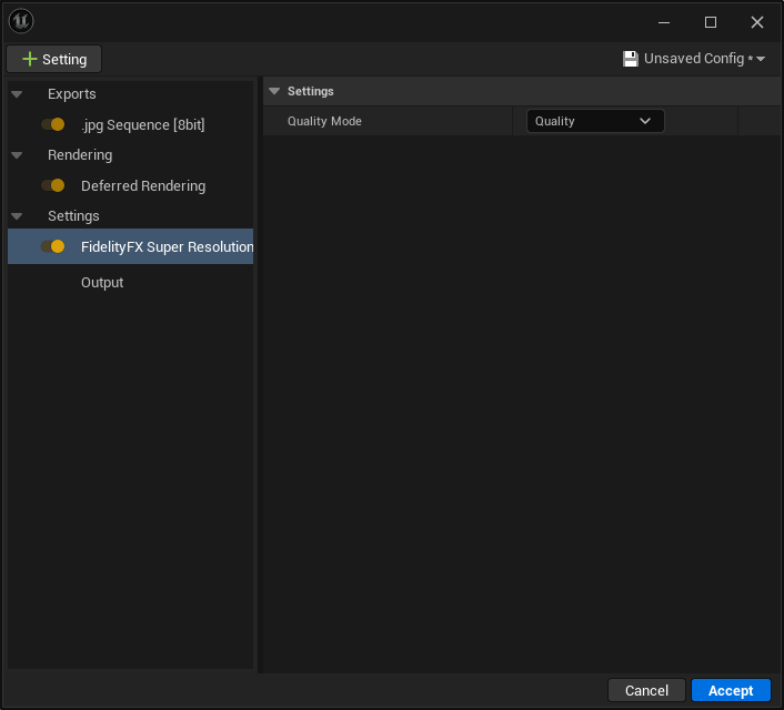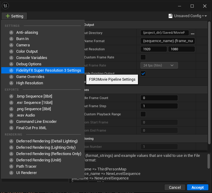 The FSR3MovieRenderPipeline plugin once enabled allows using FSR3 to accelerate rendering of Sequencer cinematics using Unreal’s Movie Render Queue.