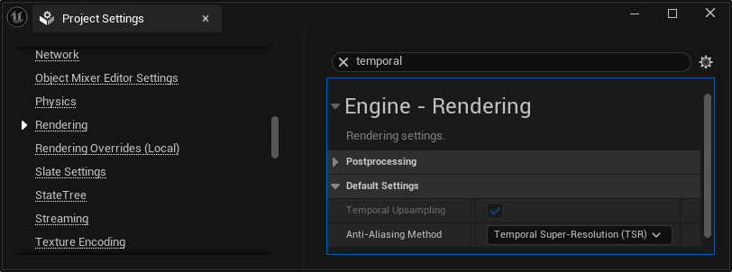 Temporal Upsampling must be enabled, and Anti-Aliasing Method should be set to Temporal Super-Resolution (TSR) in the Project Settings > Rendering window, accessed via Edit > Project Settings in the Unreal Engine toolbar or via Console Variables by enabling r.TemporalAA.Upsampling