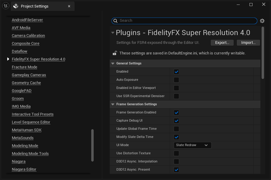 FSR 4 can be enabled or disabled via the Enabled option in the Project Settings > FidelityFX Super Resolution 4.0 settings window, or with the console variable r.FidelityFX.FSR4.Enabled