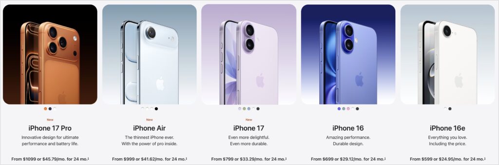 In terms of prices, the iPhone 17 starts at $799, the iPhone Air at $999, the iPhone 17 Pro at $1099, and the iPhone 17 Pro Max at $1199. If those prices are too steep for your budget, the iPhone 16e ($599), iPhone 16 ($699), and iPhone 16 Plus ($799) remain for sale.