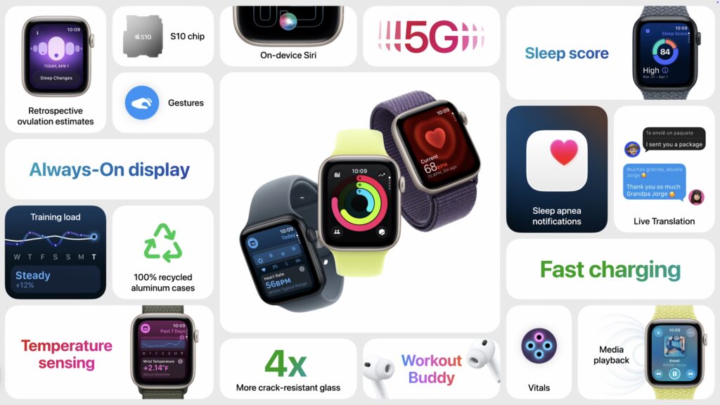 • Apple Watch Series 11: There are few changes from last year’s Series 10. A new ceramic coating improves scratch resistance, and 5G connectivity for cellular-enabled models may provide better wireless performance with less battery drain. The battery life is now rated at up to 24 hours. Apple also touted the new hypertension detection and sleep score, but both are features of watchOS 26 and will be available on some earlier models as well. The Apple Watch Series 11 is available in aluminum (jet black, silver, rose gold, and space gray) and titanium (natural, gold, and slate) finishes starting at $399 (cellular adds $100).