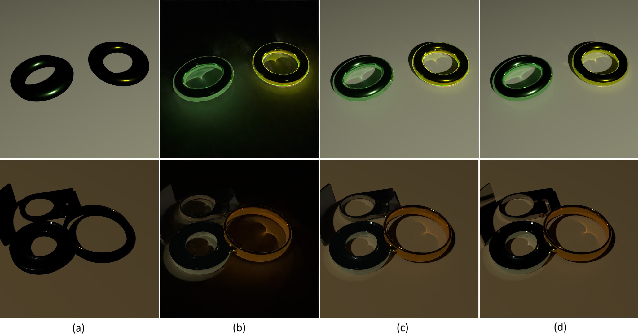 Figure 2. Our results. (a) Direct illumination, (b) Indirect illumination in our result, (c) (a)+(b) our result, (d) Reference global illumination.