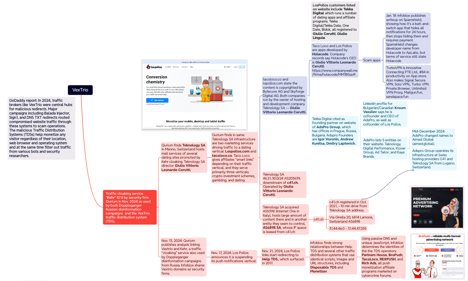 Qurium discovered that Doppelganger’s cloaking service also promoted online dating sites, and shared much of the same infrastructure with VexTrio, which is thought to be the oldest malicious traffic distribution system (TDS) in existence. While TDSs are commonly used by legitimate advertising networks to manage traffic from disparate sources and to track who or what is behind each click, VexTrio’s TDS largely manages web traffic from victims of phishing, malware, and social engineering scams.