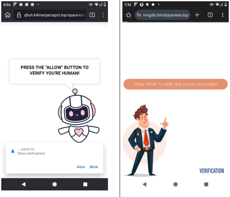 In the case of VexTrio and TacoLoco, the notification approval requests themselves are deceptive — disguised as “CAPTCHA” challenges designed to distinguish automated bot traffic from real visitors. For years, VexTrio and its partners have successfully tricked countless users into enabling these site notifications, which are then used to continuously pepper the victim’s device with a variety of phony virus alerts and misleading pop-up messages.