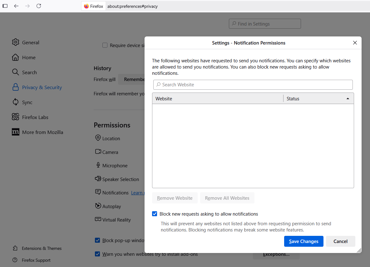 To modify site notification settings in Mozilla Firefox, navigate to Settings, Privacy & Security, Permissions, and click the “Settings” tab next to “Notifications.” That page will display any notifications already permitted and allow you to edit or delete any entries. Tick the box next to “Block new requests asking to allow notifications” to stop them altogether.