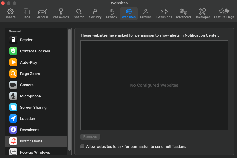 In Apple’s Safari browser, go to Settings, Websites, and click on Notifications in the sidebar. Uncheck the option to “allow websites to ask for permission to send notifications” if you wish to turn off notification requests entirely.