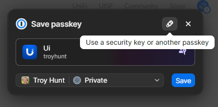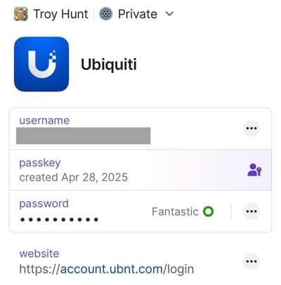 Ubiquiti is my favourite manufacturer of networking equipment, and logging onto their system gives you an enormous amount of visibility into my home network. When originally setting up that account many years ago, I enabled 2FA with an OTP and, as you now understand, ran the risk of it being phished. But just the other day I noticed passkey support and a few minutes later, my Ubiquiti account in 1Password looked like this: