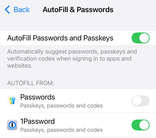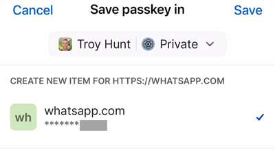 We still need passwords, we still want them to be strong and unique, therefore we still need password managers. I’ve been using 1Password for 14 years now (full disclosure: they sponsor Have I Been Pwned, and often sponsor this blog too) and as well as storing passwords (and credit cards and passport info and secure notes and sharing it all with my family), they can also store passkeys. I have 1Password installed on my iPhone and set as the default app to autofill passwords and passkeys: