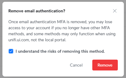 Back to Ubiquiti, and when I attempt to remove email authentication, the following prompt stops me dead in my tracks: