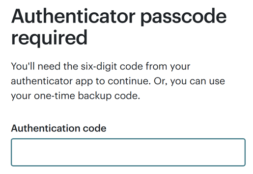 - Mailchimp validated the credentials, and because I had 2FA turned on, then displayed the OTP request screen.