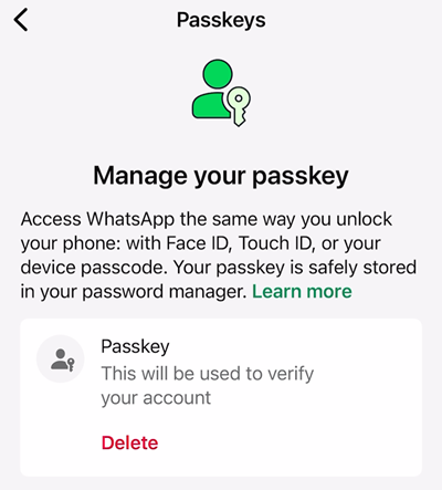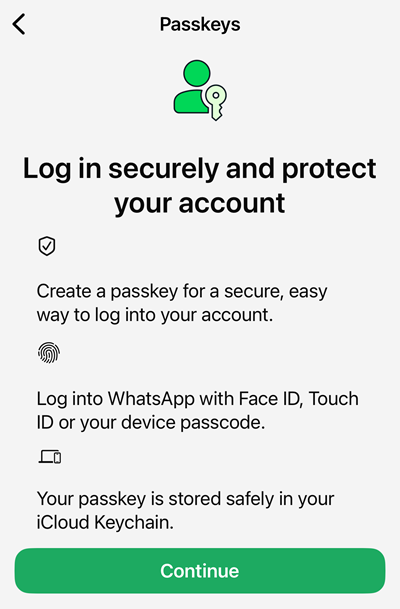 A passkey is simply a digital file you store on your device. It has various cryptographic protections in the way it is created and then used to login, but that goes beyond the scope of what I want to explain to the audience in this blog post. Let’s touch briefly on the three items WhatsApp describes above: