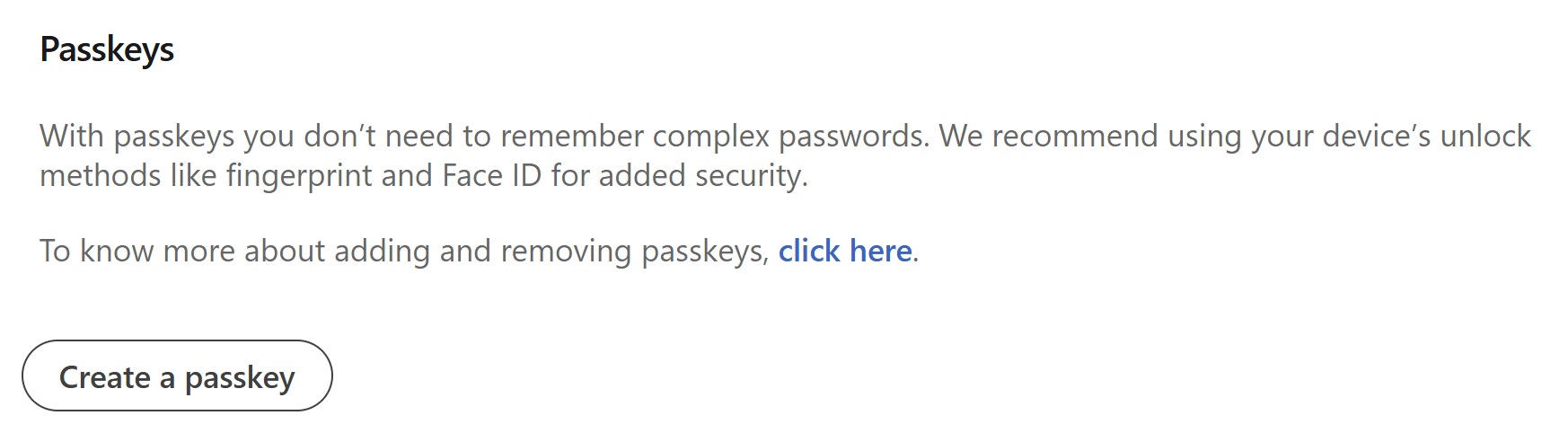 Again, your experience will differ based on which device and preferred method of storing passkeys you’re using. But what will always be the same for LinkedIn is that you can then see the successfully created passkey on the website: