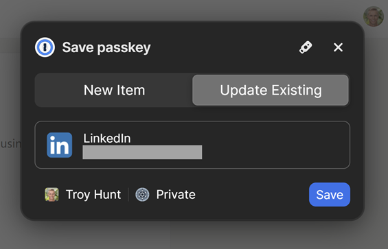 As soon as I enter that code in the website, LinkedIn pushes the passkey to me, which 1Password then offers to save: