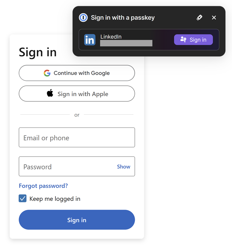 Now, let’s see how it works by logging out of LinkedIn and then returning to the login page. Immediately, 1Password pops up and offers to sign me in with my passkey: