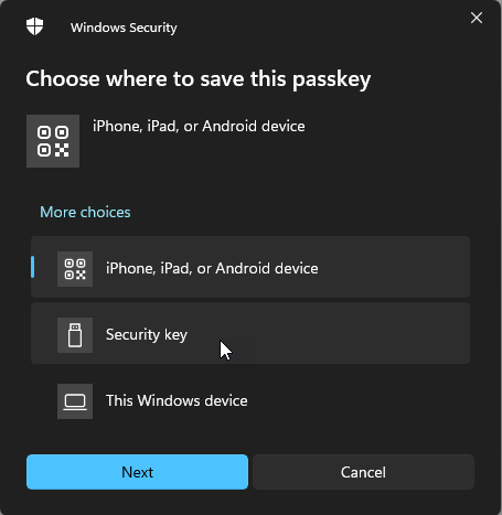 Windows then gives me a prompt to choose where I wish to save the passkey, which is where I choose the security key I’ve already inserted into my PC: