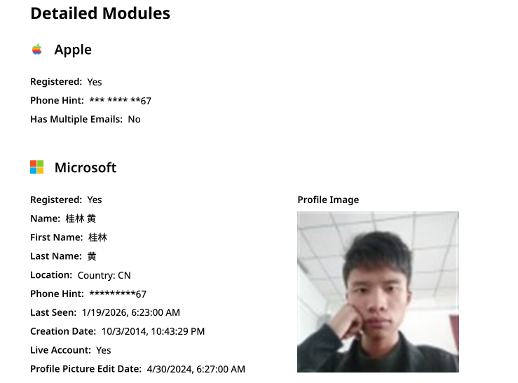 The public information attached to Guilin Huang’s Microsoft account, according to the breach tracking service osintindustries.com.